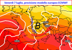 – la prima, quella più probabile, la depressione con annesso sistema frontale andrebbe in frontolisi sul Mediterraneo occidentale, sopraggiungerebbe sul nostro territorio tra venerdì 7 e sabato 8 luglio come un semplice "disturbo d’alta quota". I temporali disorganizzati andrebbero ad interessare le zone interne e montuose dell’Italia centrale e settentrionale. (probabilità 50%)