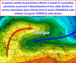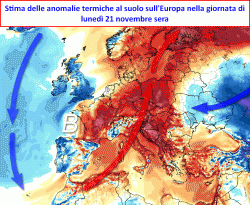 Con l’arrivo di mercoledì 23 e giovedì 24 novembre la situazione dovrebbe in parte sbloccarsi; si attenuerebbe infatti l’anticiclone sull’est Europa, la vasta figura depressionaria su Regno Unito, ovest Francia e Penisola Iberica potrebbe così avanzare verso il bacino centrale del Mediterraneo.