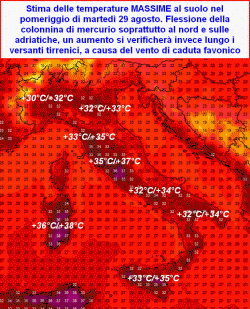 A livello puramente termico, i valori massimi sulla Valpadana non dovrebbero superare la soglia dei +32°C/+33°C, mentre potrebbe insistere il caldo intenso nelle regioni interne del centro e del sud, con picchi sino a +36°C sulla Toscana, +33°C/+35°C su Umbria, Lazio, Campania, Puglia e Basilicata. Picchi elevati anche nelle due isole maggiori con record assoluto di caldo sulla Sardegna, ove si potranno ancora raggiungere i +38°C.