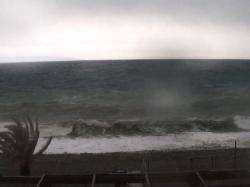 In bella evidenza, oltre al mare molto mosso, le palme sbattute dal forte vento.