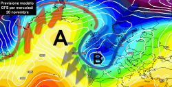 Trascorrono le ore e quello che sarà l’impianto generale dell’atmosfera che porterà come estrema conseguenza, l’arrivo sul nostro Paese di una lunga fase di tempo perturbato, appare grossomodo delineato. L’aria fredda sceglierà infatti come meta preferenziale l’Europa occidentale, andando così a collocarsi ad ovest dell’Italia, avviando una fase atmosferica piuttosto tormentata. Il percorso preciso che verrà seguito dall’aria fredda in discesa dal grande nord, conserva ancora un leggero margine di incertezza che sarebbe tuttavia in grado di apportare profonde modifiche per quanto riguarda la disposizione dei sistemi nuvolosi che agiranno sull’Italia.