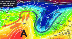 Modello ECMWF (Reading): Oggi il modello inglese appare un pò una voce fuori dal coro, rimane infatti l’unica previsione deterministica a prevedere un ingresso leggermente più orientale dell’aria fredda sull’Europa. L’Italia verrebbe sempre a trovarsi ad est dell’affondo freddo più importante che andrebbe a collocarsi in territorio francese, tuttavia i corpi nuvolosi più importanti si limiterebbero ad interessare le regioni centrali e sopratutto quelle meridionali. I settori del nord verrebbero coinvolti più direttamente dall’aria fredda, sperimentando locali episodi di instabilità ma anche lunghe "pause di riflessione" con belle fasi soleggiate. In questo contesto le temperature a livello italiano andrebbero sicuramente ritoccate al ribasso, sarebbe minore l’impatto dei flussi tiepidi ed umidi lungo lo stivale, con temperature che risulterebbero decisamente fresche sul nord e su parte dei settori centrali italiani, mite e molto umido solo al sud.