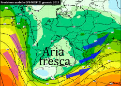 Il passaggio di un sistema frontale più organizzato è atteso solo nella giornata di martedì 21 gennaio, quando una vera e propria "spallata" dell’anticiclone azzorriano sull’Europa e sul Mediterraneo occidentale, determinerà un’evoluzione a levante dell’intero complesso depressionario. In questo frangente è atteso un calo della temperatura che determinerà anche per le regioni del sud, un ritocco verso il basso della quota neve. Lo Scirocco delle giornate precedenti andrà attenuandosi, sostuito dall’arrivo del Libeccio apportatore di temperature più fresche e qualche episodio di instabilità in più. Le precipitazioni potrebbero interessare con particolare insistenza dapprima i settori del medio e basso Tirreno e la Sicilia, successivamente (notte tra 21 e 22 gennaio) andranno coinvolgendo anche Basilicata, Puglia e Molise, persistendo ulteriormente sulla Sicilia orientale, la Calabria e la Campania.