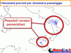 Su questi settori saranno anche possibili rovesci sparsi e qualche isolato e breve spunto temporalesco, in particolare nella zona del Pollino. In mappa il riassunto dei fenomeni previsti per il pomeriggio di domenica dal nostro modello WRF.