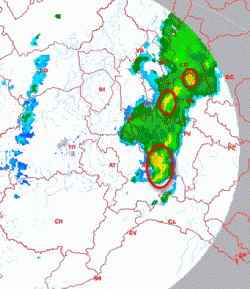 Con i cerchi rossi abbiamo segnato le zone dove le precipitazioni sono piu intense.