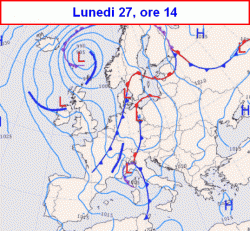 Nelle ore centrali di lunedì il fronte si distenderà sulla nostra Penisola con il suo ramo freddo. Il minimo barico che controllerà la situazione sarà centrato sul Mar Ligure. Il ramo occluso del sistema (ovvero una conca di aria caldo-umida alle quote superiori) agirà sul nord-ovest con rovesci o temporali di chiusura e un calo della quota neve sulle Alpi.