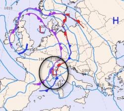 Si tratta di una crisi perturbata "classica", con un minimo in prossimità del Golfo Ligure.