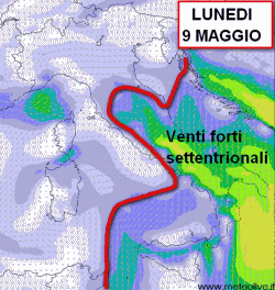 La goccia fredda a tutte le quote che scenderà dai Balcani verso le nostre regioni meridionali, oltre a determinare un calo delle temperature e qualche temporale occasionalmente grandinigeno, farà rinforzare sensibilmente il vento dai quadranti settentrionali.