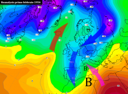Nelle quattro cartine abbiamo evidenziato alcuni dei passaggi salienti accorsi nell’inverno del 1954 che rendono chiara l’idea del pattern barico ideale alla realizzazione di una consistente ondata di gelo in Europa.