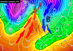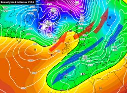 Nella seconda cartina viene mostrata la circolazione atmosferica intervenuta durante una fase perturbata che investì l’Italia il primo febbraio 1954. La fase di maltempo fu provocata dalla formazione di un minimo secondario di bassa pressione in conseguenza dell’entrata fredda in Europa e portò neve su diverse zone del Paese.