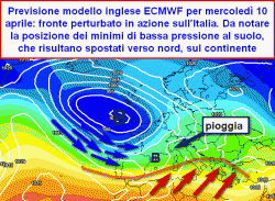 Ancora conferme da parte dei modelli di previsione per quanto riguarda l'arrivo di un passaggio frontale mercoledì 10 aprile, questa volta in chiave spiccatamente primaverile. Appare posticipato l'arrivo dell'anticiclone sulla nostra penisola.