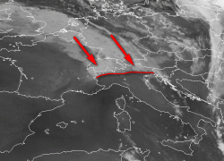 Ecco il fiume di nubi che dall’Europa centrale sbatte letteralmente contro le Alpi, per poi dissolversi sui nostri versanti.