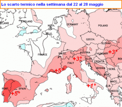Ha fatto caldo anche nell’ultime settimana di maggio, ovvero quella che abbraccia il periodo tra il 22 e il 28 del mese. L’anomalia però non risulta climaticamente significativa dato che si parla di scarti termici minimi.