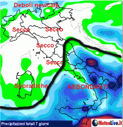 La cartina sopra riportata si riferisce alla piovosità in Italia nei prossimi sette giorni e non fa altro che rispecchiare quello che abbiamo già detto: secco assoluto al nord (a parte brevi nevicate sui rilievi di confine); secco anche sulla Toscana ed il Lazio; piogge sporadiche sulla Sardegna ed abbondanti al sud, quasi di tipo alluvionale nel sud della Sicilia.