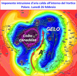 Le conseguenze presto dette, porteranno ad uno "split", cioè una divisione completa del vortice in due grandi tronconi. L’aria calda in risalita dall’oceano Atlantico alla regione polare, determinerà su questi settori un aumento delle temperature anche sino a 15/20°C rispetto ai valori normali. L’aria gelida verrà quindi spodestata dalla sua sede originaria e costretta ad interessare con moto antizonale (da est verso ovest) il nostro continente europeo, laddove è previsto spingersi un vero e proprio lobo del vortice siberiano.