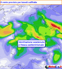 Lunedì il vento sarà accompagnato anche da aria piuttosto umida che darà luogo a condizioni di moderata instabilità sul medio versante adriatico e al meridione. Qui sono previsti anche rovesci. In seguito la massa d’aria si farà più asciutta e riporterà il sole, ma seguiterà a interessare con una moderata ventilazione le nostre regioni centrali e meridionali fino a mercoledì.