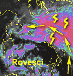 La depressione sulla Sicilia pompa aria caldo-umida sul suo fianco destro ( frecce gialle), un autentico treno di vapore che porta con sè precipitazioni anche molto intense.