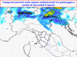 Una importante circolazione di bassa pressione si approssima al bacino centrale del Mediterraneo ed alla Mitteleurope; tali settori rientrano già in queste ore lungo il lato ascendente della saccatura, con nuvolosità in aumento sulle regioni settentrionali, per ora senza essere associata ad alcuna precipitazione di rilievo. La nostra depressione indugerà un po’ al varco della porta occidentale, prima di entrare in modo franco col suo carico d’aria fredda sul nostro territorio. I temporali nelle giornate di mercoledì 9 agosto e giovedì 10, andranno