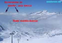 Si nota molto bene lo strato di aria umida che si spinge fino a 2500 metri di quota (all’incirca). Si tratta dell’azione di un blando ritorno di correnti da est che resta letteralmente improgionato tra i monti e le valli della zona.