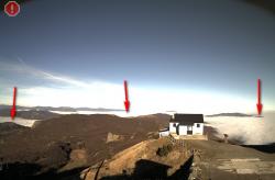 Le vette delle montagne invece sono sopra. La prima webcam è situata sul Monte Laghicciolo, 1260 metri in Val Trebbia, entroterra ligure. Notate il limite netto tra l’aria calda e secca dell’alta pressione ( che agisce in quota) e il freddo umido, condito anche da nuvolosità, che agisce più in basso.
