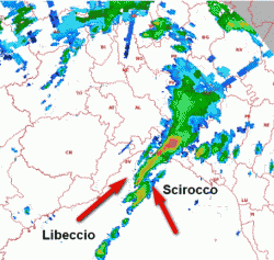 Nel punto dove i due venti convergono, si ha la famigerata LINEA DI CONVERGENZA in seno alla quale si sviluppano intensi moti verticali che letteralmente "sbattono in alto" l’umidità presente nei bassi strati. Ecco allora la costruzione delle nubi temporalesche lungo questa linea, che si muovono però nel letto delle correnti sud-occidentali alle quote superiori.