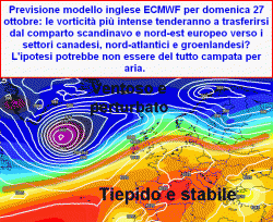 Nonostante la statistica remi a sfavore su questo tipo di evoluzione, il tempo atmosferico sino alla fine di ottobre, non presenterà alcun anticipo dell’inverno e del freddo. L’attività depressionaria nord-atlantica dovrebbe anzi intensificarsi ulteriormente, garantendo una conclusione di ottobre su valori di temperatura assai miti. Un parziale rientro delle temperature nella media stagionale potrà verificarsi solo partendo dagli ultimissimi giorni di ottobre (più probabile i primi di novembre) senza che via sia presagio di alcuna ondata di freddo imminente.