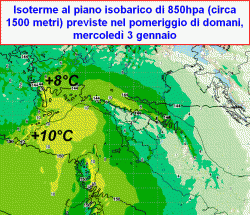 Sulle regioni settentrionali, mercoledì 3 gennaio ritroveremo isoterme sino a +10°C sul piano isobarico di 850hpa (circa 1500 metri) in seno ad una corrente occidentale. Trattasi di un valore di tutto rispetto, la cui origine è da ricercare in un vero