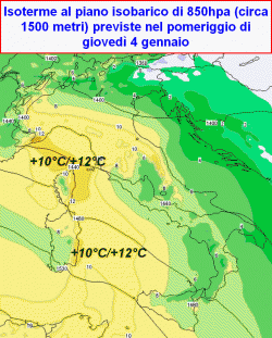 e proprio effetto favonico indotto che verrà a manifestarsi nel momento in cui un flusso d’aria già mite scavalcherà il baluardo alpino per gettarsi a capofitto sui nostri versanti. Giovedì 4 e venerdì 5 gennaio l’aria mite conquisterà anche le regioni centrali e meridionali, anche qui con valori previsti ad 850hpa sino a +10°C/+12°C.