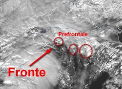 Il sistema frontale principale è preceduto da nubi a sviluppo verticale, foriere di temporali che in queste ore stanno interessando soprattutto la Liguria e l’alta Toscana. Con i cerchi rossi abbiamo contrassegnato tre di queste formazioni instabili, che al suo interno portano grandine o neve tonda.