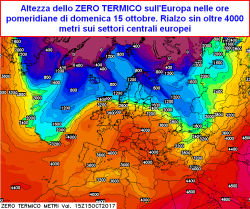 Il periodo di maggior vigore del nostro anticiclone è previsto tra venerdì 13 e domenica 15 ottobre; saranno in assoluto le giornate più stabili e calde, secondo le prime stime, al piano isobarico di 850hpa (circa 1500 metri) graveranno sull’Europa centrale isoterme comprese tra +12°C e +15°C, degne del periodo estivo. I valori risulteranno molto miti anche ad alta quota, con isoterme stimate sino a -10°C al piano isobarico di 500hpa che verrà a trovarsi molto in alto, sino a sfiorare i 5600 metri di altitudine.