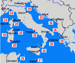 La forbice tra i bacini settentrionali e meridionali è abbastanza ridotta. Si va, difatti, dai 24° del Mar Ligure e Mare di Corsica ( che riesentono ancora delle maestralate di inizio mese) ai 27° del braccio di mare di fronte a Malta.