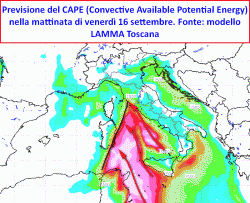 La seconda fase di questo importante passaggio perturbato, entrerebbe in scena venerdì 16 settembre; il rallentamento della depressione sui nostri mari, andrebbe inevitabilmente a rallentare l’intera dinamica instabile, favorendo un’importante richiamo d’aria molto calda ed umida di Scirocco, pronta ad investire i settori del medio e del basso Tirreno. Alcuni lam individuano in questa massa d’aria, parametri temporaleschi di notevole portata. Ne deriverebbe un’aspra convergenza con la formazione di strutture temporalesche importanti. Questi temporali nascerebbero poco distanti dalle coste orientali sarde per poi dirigersi velocemente verso i settori centrali tirrenici (bassa Toscana – Lazio) con fenomeni di forte intensità pronti ad investire tali regioni già dalla mattinata di venerdì e per tutto il pomeriggio.
