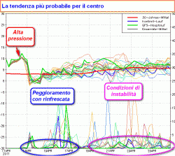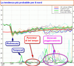 Punti cumuni: il raffreddamento di mercoledì 13 e l’instabilità intorno al periodo pasquale. Per il resto dobbiamo distinguere una possibile parentesi di bel tempo per il nord tra il 17 e il 19 aprile (prima figura), una fervente instabilità al centro, in particolare lungo l’Adriatico, tra il 15 e il 17 aprile (seconda figura) e la decisa instabilità al sud tra il 22 e il 25 aprile (terza figura).