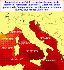 A conti fatti, abbiamo un ribasso di un paio di gradi che si é manifestato sul golfo del Leone, sul mar di Corsica e sull’alto Tirreno. L’azione estremamente calda portata dall’anticiclone africano che ha persistito sulla porzione centro-orientale del Mediterraneo almeno sino allo scorso venerdì, ha portato qui un rialzo delle temperature marine sino alla soglia dei +28°C, anche qui estremamente superficiali. L’aria fresca è poi sopraggiunta anche su queste regioni ma gli effetti portati sulle temperature marine sono stati inferiori, con un ribasso di circa un grado rispetto all’apice della fase calda.
