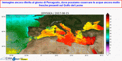L’arrivo della goccia d’aria molto fresca, oseremo dire quasi FREDDA, intervenuta sul nostro territorio la scorsa settimana, ha avuto un impatto anche sullo stato delle temperature superficiali marine del nostro mar Mediterraneo. Il Libeccio ed il Maestrale che ha soffiato burrascosamente tra venerdì e sabato scorsi, ha rimescolato notevolmente le acque superficiali surriscaldate con quelle più fredde presenti in profondità. Parte di questo calore è stato dissipato anche dall’azione vera e propria di raffreddamento operata dalla ventilazione sopradescritta, erodendo lo strato estremamente superficiale di acque calde surriscaldate dall’anticiclone africano.