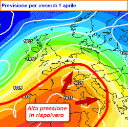 In mappa è disegnata con inequivocabile eloquenza la posizione più probabile del grande anticiclone così come la vedono i nostri modelli alla fine della prossima settimana, ed esattamente nella giornata di venerdì 1 aprile.