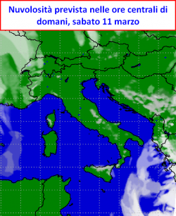 Come anticipato, sotto il profilo della nuvolosità, oltre agli addensamenti previsti lungo l’arco alpino, nubi sparse interesseranno quindi i versanti del basso Adriatico nella giornata di domani, sabato 11 marzo, una risacca di venti meridionali potrà accumulare nubi basse anche sul Tirreno domenica 12.