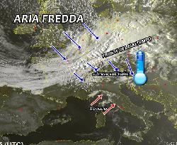 L’aria fredda inizierà ad affluire in serata sull’arco alpino e nella notte in pianura Padana apportando un calo drastico delle temperature anche di oltre 12-13°C. L’aria fresca sarà accompagnata anche da venti fortissimi di Bora che potrebbero causare qualche danno sul nord-est (specie sulle coste). Inoltre il passaggio dell’aria più fredda potrà innescare acquazzoni e temporali dalla durata di qualche ora sul lato adriatico, tra la notte e domani sera.