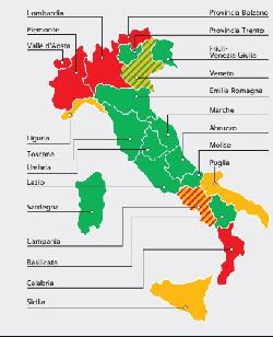 Nelle prossime ore si conoscerà con esattezza la suddivisione delle regioni nelle tre fasce. Secondo le ultime indiscrezioni lo scenario potrebbe essere questo: