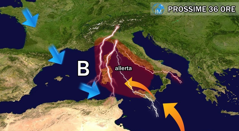 Il cuore della perturbazione raggiungerà l’Italia nel corso di stasera e domani, apportando fenomeni diffusi e a tratti violenti. In particolare ci aspettiamo la formazione ci una poderosa "squall-line", ovvero una "linea temporalesca" scaturita dallo scontro tra l’aria fredda artica proveniente da ovest e l’aria umida e calda di scirocco. Questa vasta area di instabilità, colma di temporali molto incisivi, colpirà la Sardegna da stasera, mentre nella notte si estenderà anche a Liguria, Toscana e Lazio scatenando intense piogge, locali grandinate, forti colpi di vento e tantissimi fulmini.