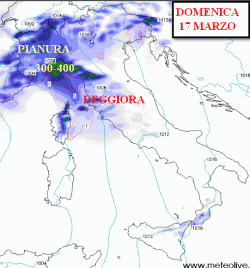 Domenica peggiora al nord a partire da ovest con precipitazioni nevose anche a bassa quota sul settore occidentale, specie su Piemonte, Valle d'Aosta e Varesotto. Piogge anche sulla Toscana. Lunedì tempo perturbato con precipitazioni anche intense al nord, nevose a bassa quota sulle Alpi, sul Piemonte e su parte della Lombardia, rovesci anche sulle centrali tirreniche. Martedì ultimi rovesci nevosi su est Alpi, variabile altrove, con schiarite.