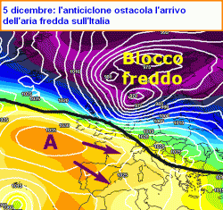 Facciamo ora un passo indietro: quella pubblicata qui a fianco è la mappa prevista per la giornata di giovedì 5 dicembre: si nota una netta demarcazione tra le correnti perturbate, con il loro punto di forza nel nucleo di aria molto fredda pronto a staccarsi dalla circolazione polare per raggiungere l’Europa centro-orientale, e la banda anticiclonica che si sta organizzando a spalle larghe dall’Atlantico verso il Mediterraneo.
