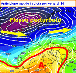 ANALISI della situazione attuale: il flusso perturbato principale scorre a basse latitudini e, all’altezza della regione Iberica, si inserisce entro una vasta ruota depressionaria centrata sull’Atlantico. L’onda è instabilizzata da diversi assi di saccatura che si snodano fin sul continente europeo, interessandolo con una sequenza quasi ininterrotta di perturbazioni. L’alta pressione russa, ancora visibile sui suoi territori di origine, tende a far muro, bloccando l’evoluzione verso levante delle correnti perturbate, le quali avranno così modo di instistere ancora per diversi giorni anche sul Mediterraneo e l’Italia.