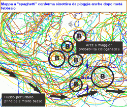 Lo possiamo notare dall’ultima mappa in basso, una mappa che vi proponiamo in esclusiva e che a prima vista sembra alquanto complessa. In realtà mostra l’andamento probabilistico del campo di pressione su alcuni importanti piani isobarici (a quote diverse) e quindi il disegno sinottico più probabile a lungo termine. Il "caos" dovuto alla dispersione delle varie linee di riferimento (dette "spaghetti") testimonia la lunga gittata di questa carta, che si riferisce infatti al giorno 16 febbraio.