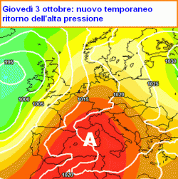 Si tratta di un ulteriore colpo di scena: la depressione euro-mediterranea infatti verrà spinta da una accelerazione del Getto portante verso levante e verrà rimpiazzata da una nuova puntata anticiclonica, che si svilupperà dalle regioni subtropicali lungo i mediterranei europei. Tra martedì 3 e mercoledì 4 ottobre dunque rinnovata fase di tempo ben soleggiato su tutta l’Italia, con temperature in nuovo aumento.