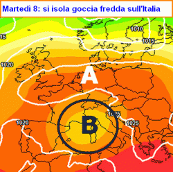 La spinta anticiclonica atlantica sarà così decisa che si andrà a saldare con l’alta scandinava, generando il cosiddetto blocco a bicella. La saccatura giunta sul Mediterraneo subirà un processo di cut-off, ovvero rimarrà isolata ponendo in essere quella che in gergo è noto come goccia fredda.