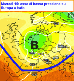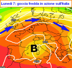 ANALISI della situazione attuale: il flusso perturbato principale scorre intorno al 60° parallelo mostrando un delta (un bivio) all’altezza della Danimarca: il ramo settentrionale va ad alimentare un profondo centro di bassa pressione sito sul mar di Norvegia, quello meridionale si inserisce in una struttura di bassa pressione secondaria posto in corrispondenza dell’Italia. Ad ovest, l’alta pressione delle Azzorre interessa penisola Iberica e Francia spingendosi con il promontorio fin quasi sull’Europa centrale. Da questa posizione favorirà il successivo isolamento di una goccia depressionaria sull’Italia.