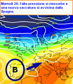 L’alta pressione, nonostante la fiammata notevole, non riuscirà a stabilizzarsi sulla nostra Penisola. La sua struttura verrà infatti insidiata dalla calata di una nuova saccatura dalle latitudini polari, che causerà una generale discesa della pressione su tutto il suolo europeo già a partire da lunedì 28. Martedì 29 una depressione nuova di zecca si sarà disegnata sulla penisola Iberica e inizierà a sospingere aria nuovamente più umida (ma sempre mite per la stagione) alla volta del nostro Paese.