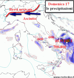 Domenica rientro di correnti orientali sull'Italia, con qualche fiocco di neve sulla fascia prealpina e precipitazioni al sud. Lunedì qualche debole nevicata al mattino sul Piemonte occidentale, precipitazioni al centro-sud, freddo ovunque. Martedì tregua su tutta la Penisola, con le ultime precipitazioni al sud, in allontanamento.
