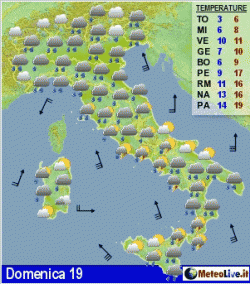 Domenica piogge estese a gran parte d'Italia con ulteriori apporti nevosi sulle Alpi. Lunedì precipitazioni soprattutto al centro, qualche schiarita al meridione, specie zone estreme e in serata al nord. Martedì piogge al centro-sud, asciutto al nord, poco freddo.